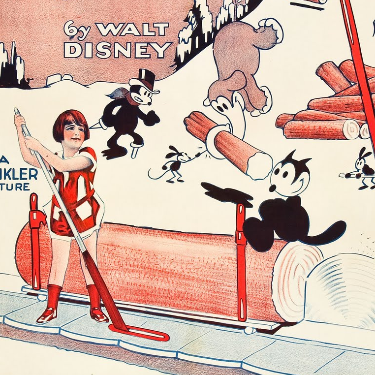 Alice the Lumber Jack -elokuvan (1926) juliste (klikkaa koko kuva auki). Elokuvat tehtiin samalla tekniikalla kuin mm. 1950-luvun Maija Poppanen: Margie Gay näytteli kameran edessä, ja tämän ympärille on myöhemmin animoitu piirroshahmoja ja taustoja.