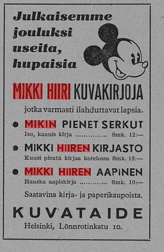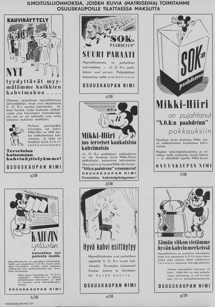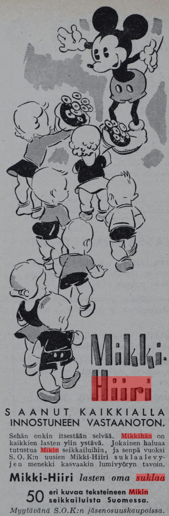 Tämän jälkeen juttuja alkaa olla enemmän. 1930-luvun lopulla Disneyllä alkoi olla Suomessa jo paitsi toimintaa (Mikki-Hiirellä oli omia kuvakirjoja), niin nimellä myytiin myös Suomen Osuuskauppojen Keskusliiton (SOK, eli S-ryhmä) toimesta suklaata ja kahvia: