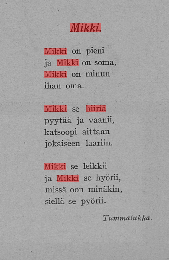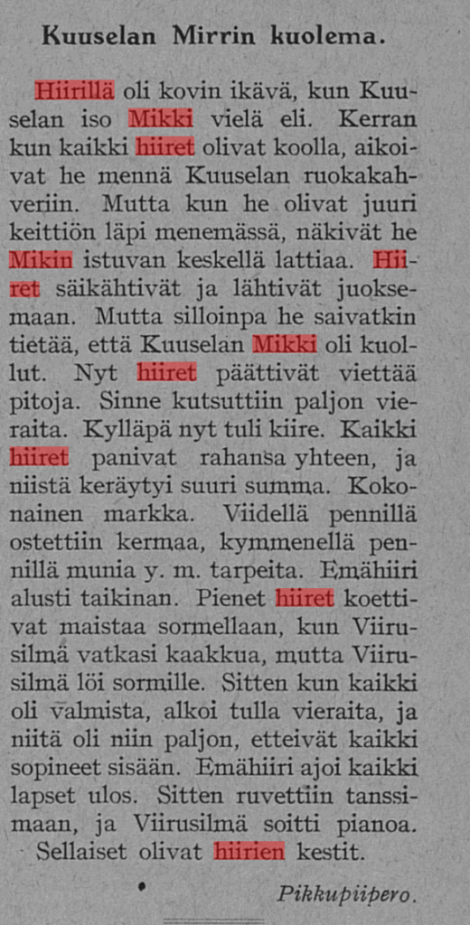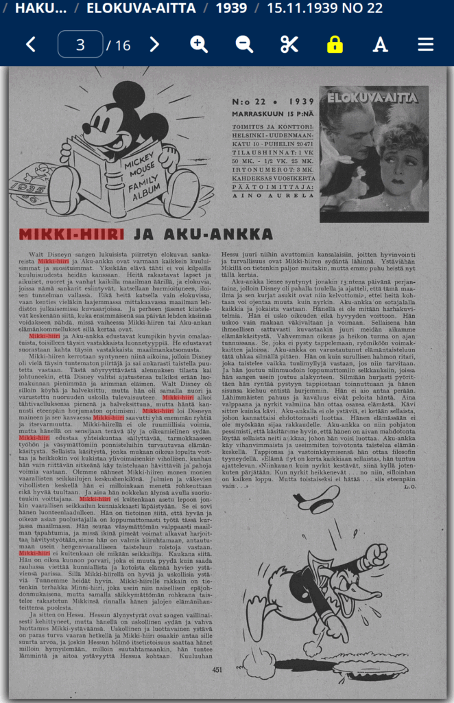 Kansalliskirjaston lehtiarkiston hausta kuitenkin löytyikin osumia ”Mikki hiiri” -hakusanalla ja nimenomaan satuihin viitaten: yllättäen Mikki oli kuitenkin hiiri…kissa (oheiset esimerkit ”Pääskysestä”).